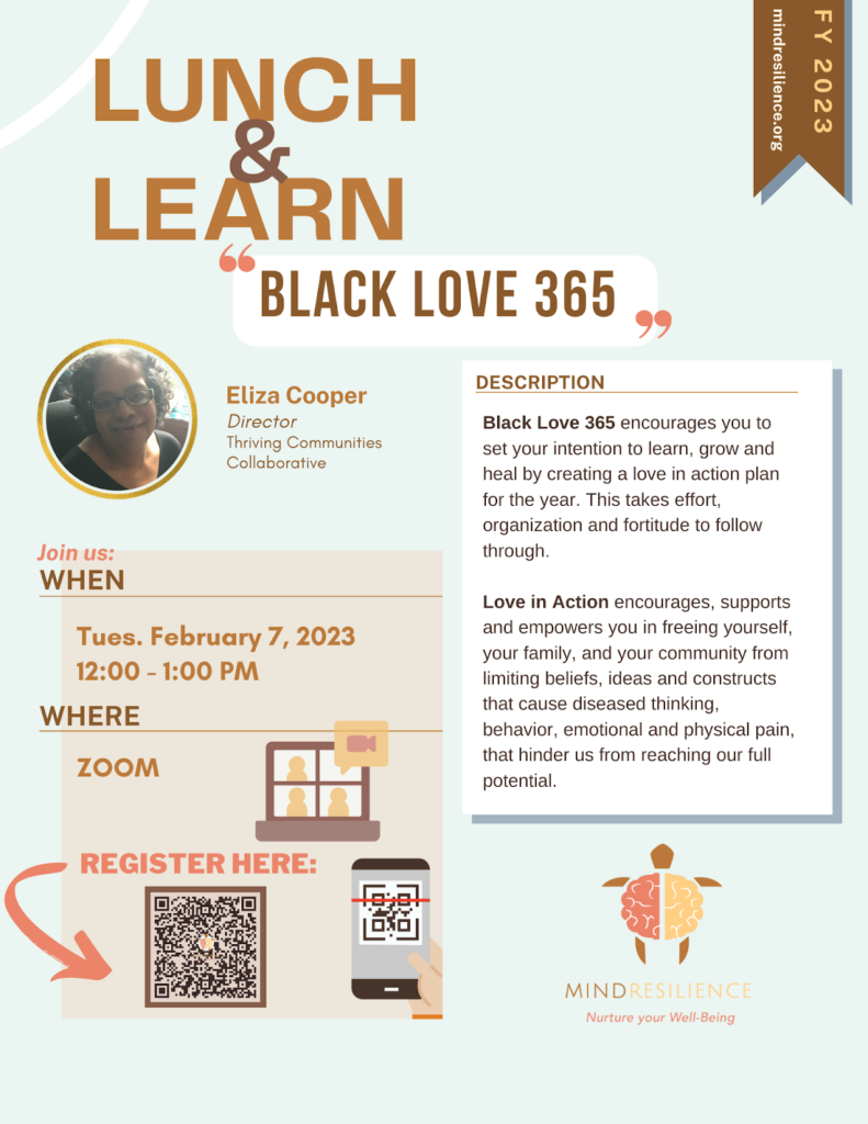 The BHA Mind Resilience Committee is hosting our next Lunch & Learn on February 7, 2023 from 12 noon to 1 p.m. The presentation is titled “Black Love 365” by Eliza Cooper, Director of Thriving Communities Collaborative. It is a free virtual learning opportunity and celebration focused on encouraging us to set our intentions to learn, grow, and heal by creating a love in action plan for the year. Please register in advance here: https://umaryland.zoom.us/