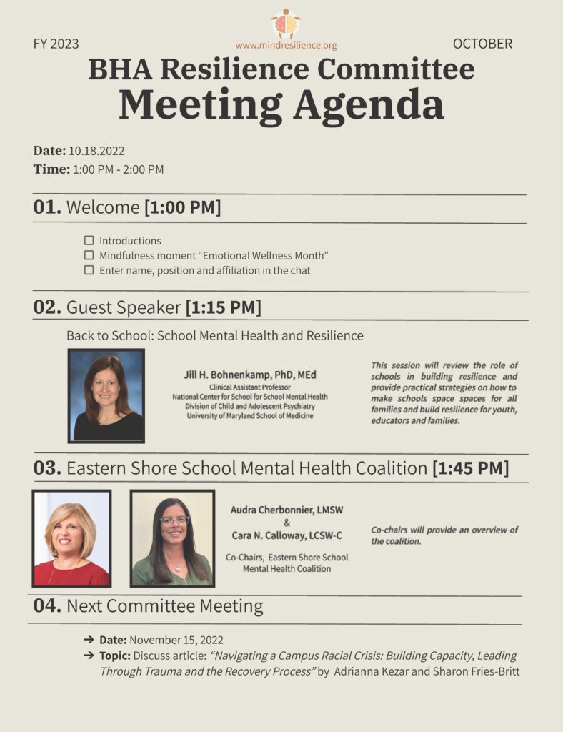 At 1:45, Audra Cherbonnier, LMSW and Cara N. Calloway, LCSW-C will provide a quick overview of the Eastern Shore School Mental Health Coalition.